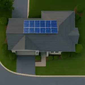 A 3D-rendered isometric house model featuring solar panels on the roof, representing sustainable and renewable energy solutions